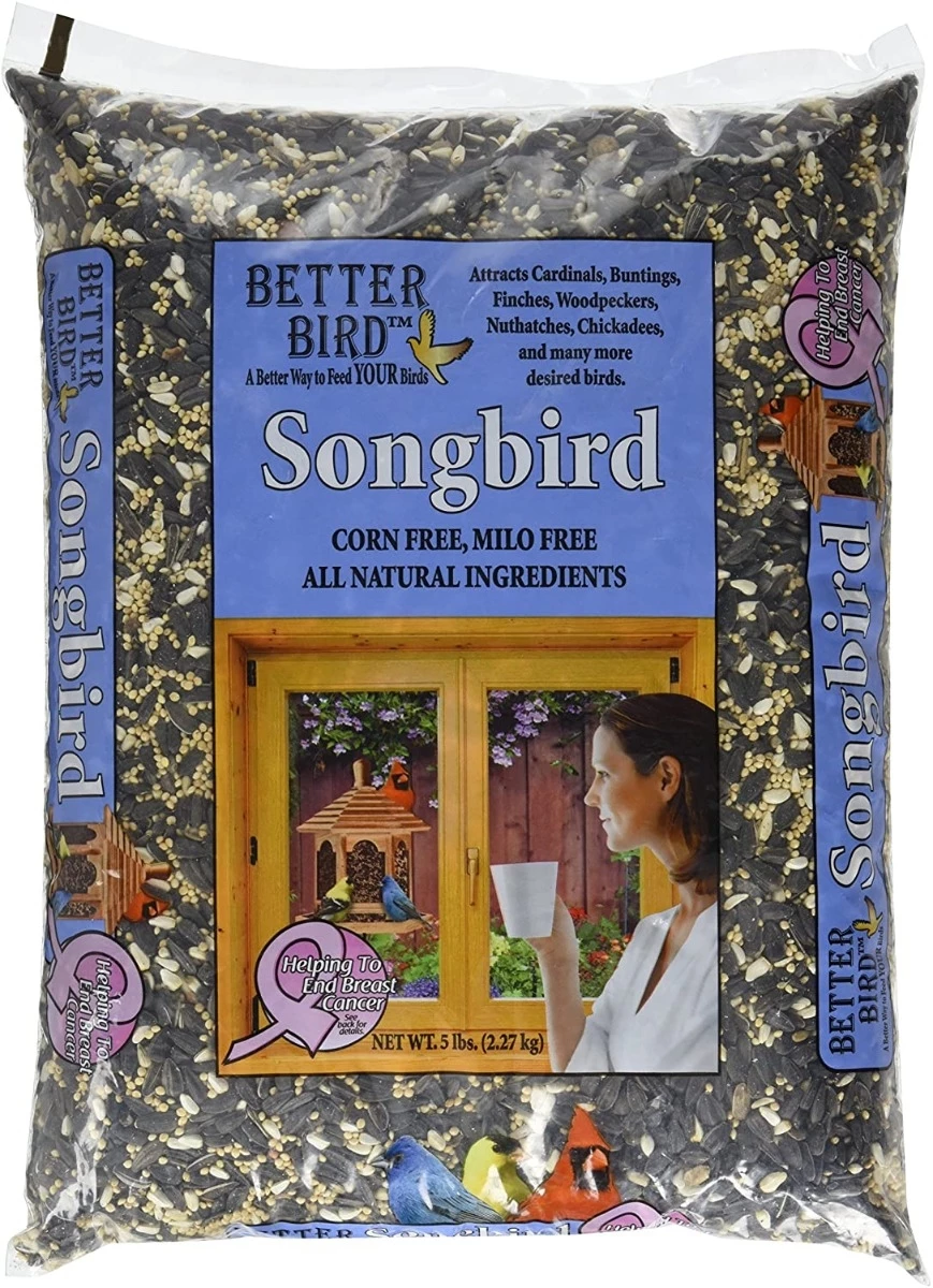 Better bird Songbird Food is an all-natural seed free of corn and milo. Great for attracting many types of wild birds including cardinals, buntings, finches, woodpeckers, nuthatches and chickadees.