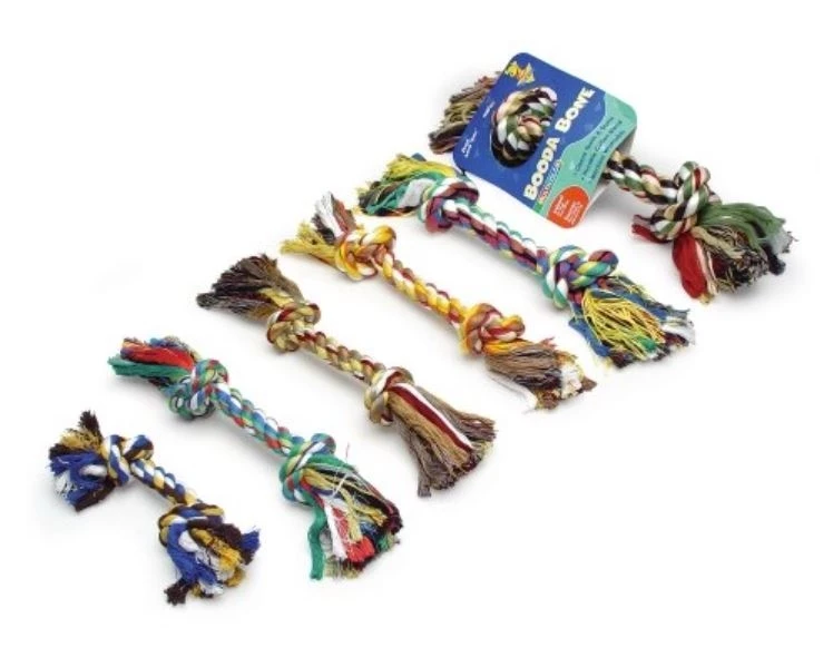 Multi-colored Booda® 2-Knot Rope Bones can be used for interactive play or as solo dog chews. These rope bones are a fun and easy way to floss your dog’s gums and help prevent dental disease by fighting plaque and control tartar. They feature machine washable, tightly twisted cotton for long-lasting durability.