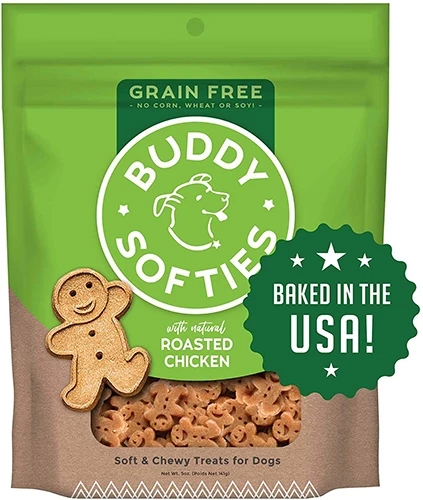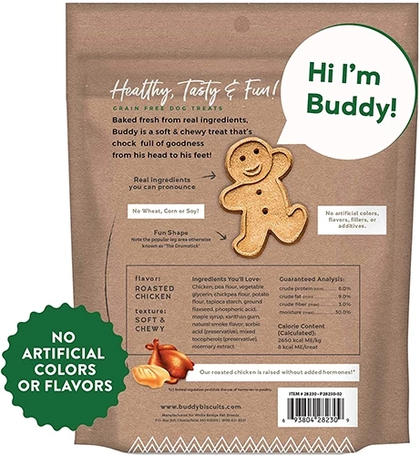 Buddy Biscuits Grain Free Soft & Chewy Dog Treats, Small Dog or Large Dogs Training, Healthy Roasted Chicken 5 oz Soft & chewy grain free Buddy Biscuits are palatable with no crunch. An excellent choice for all dogs, especially older dogs or smaller dogs who prefer a softer treat. Along with indulging your pup, Buddy Soft & Chewy treats are also perfect for training, with a low calorie count and chock full of flavor to keep your dog motivated. Buddy Biscuits are also made in the USA with only quality, recognizable ingredients. – Healthy dog treats made with quality ingredients and natural roasted chicken – Palatable, chewy dog treats perfect for older dogs – Grain free dog treats with no added wheat, corn, soy, fillers, artificial colors or flavors – Wholesome, oven baked dog treats baked in USA only.