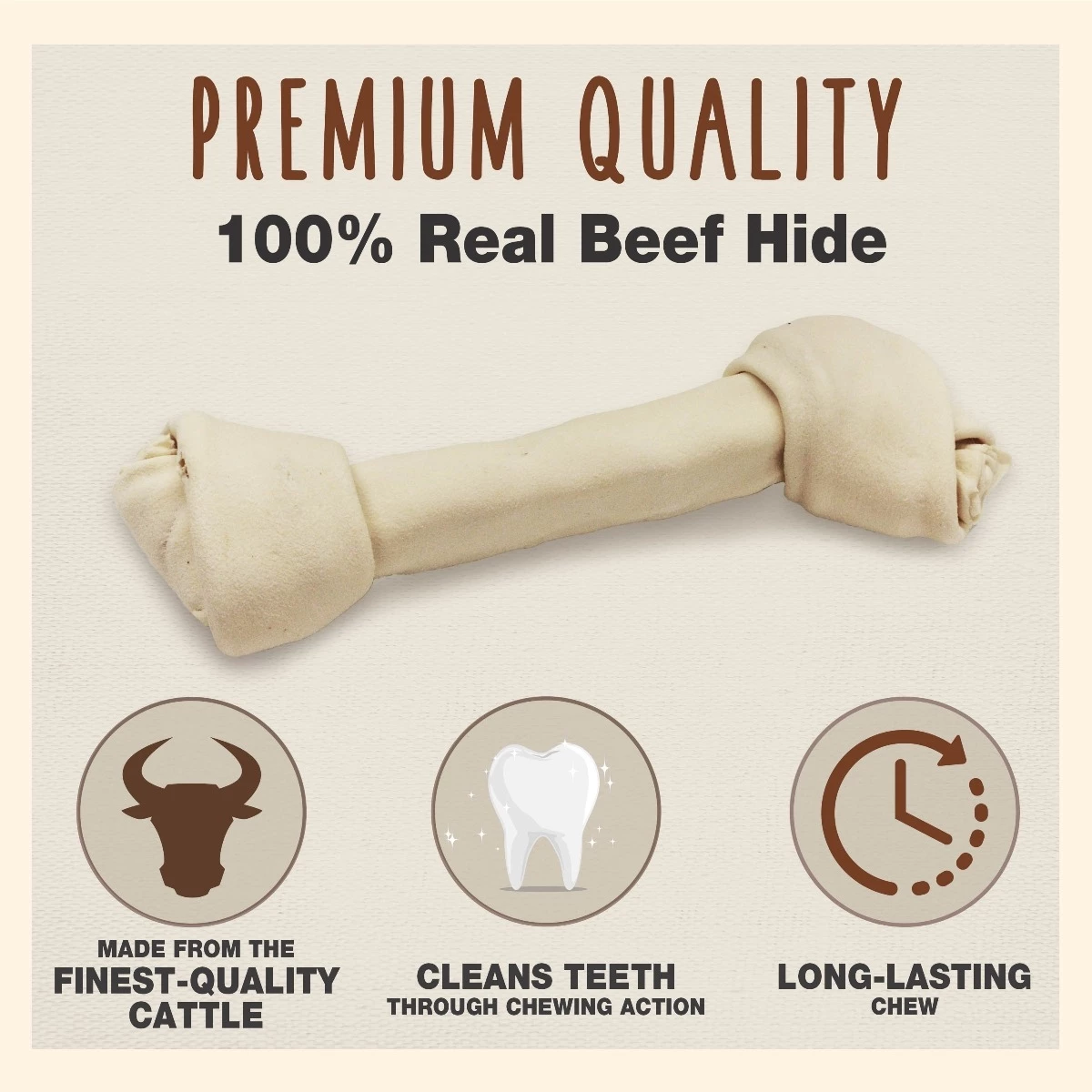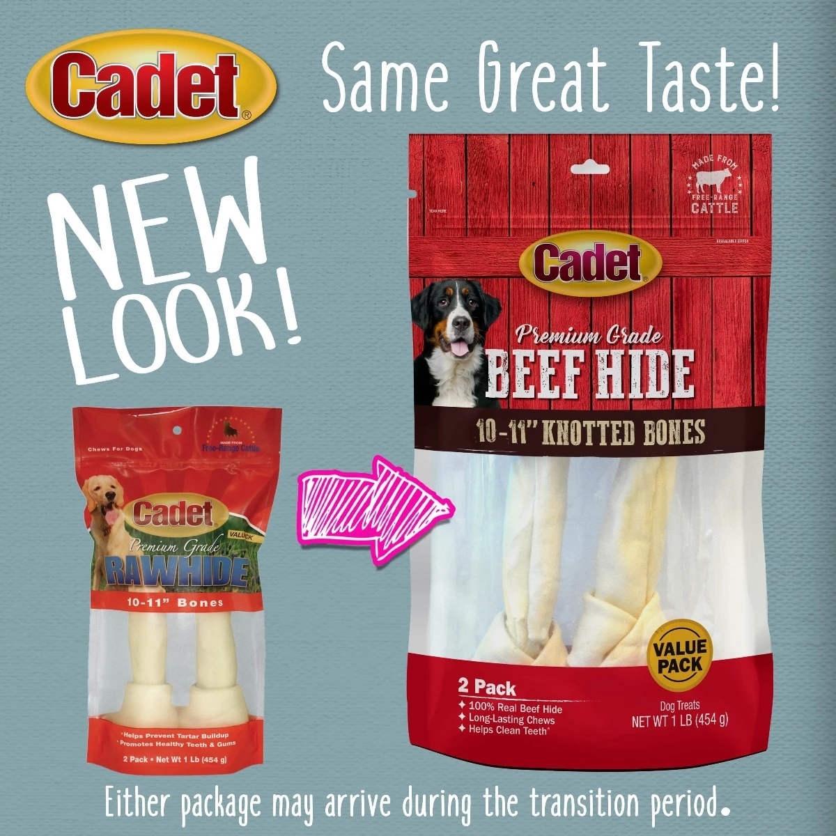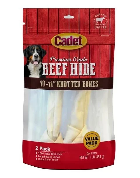 Cadet Knotted Beef Hide Bones are premium-quality, irresistible chews that dogs crave. Made of 100% real beef hide sourced from the finest-quality cattle, each knotted bone is a wholesome reward to give your best friend. These long lasting dog chews will keep your dog occupied and help discourage destructive chewing. Plus, they promote healthy teeth and gums by preventing plaque and tartar buildup as dogs chew. Treat your Cadet to enjoyment that lasts!