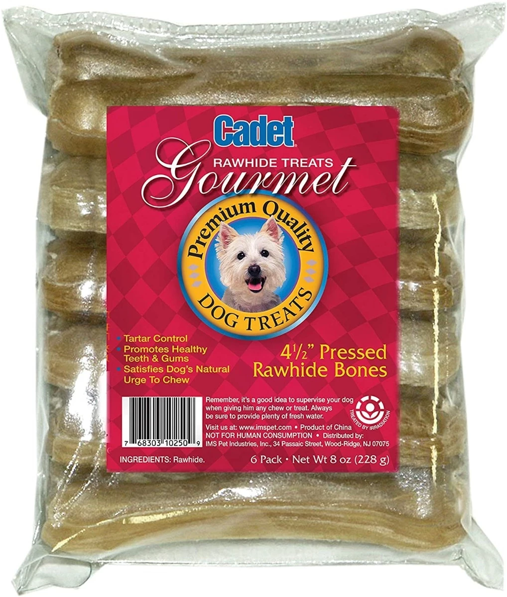Cadet Pressed Beef Hide Dog Bones are made with tightly compressed layers of 100% natural, premium-quality beef hide sourced from the finest-quality cattle. Each long-lasting bone gives dogs the satisfying, natural rawhide taste they crave. A great dog chew for aggressive chewers, these single-ingredient pressed rawhide bones last longer than traditional rawhide to keep your dog busy and happy. Plus, they promote dog dental health by preventing plaque and tartar buildup as your dog chews.