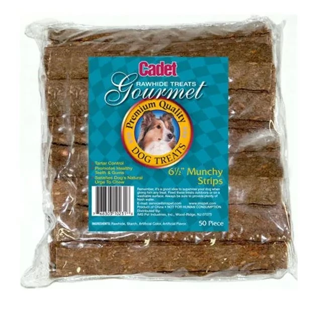 Cadet Rawhide Munchies are premium-quality, beef-basted rawhide chews that keep dogs busy. These rawhide bars are a savory treat with the naturally delicious beef taste dogs crave. Plus, this high-protein, low-fat chew promotes healthy teeth and gums.