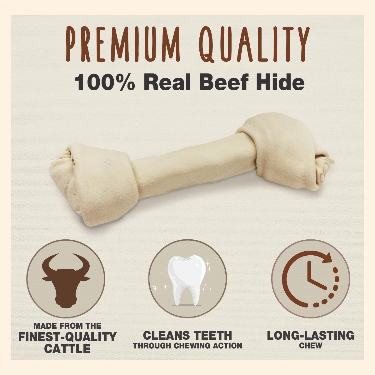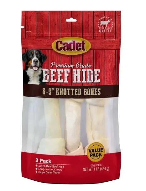 Cadet Knotted Beef Hide Bones are premium-quality, irresistible chews that dogs crave. Made of 100% real beef hide sourced from the finest-quality cattle, each knotted bone is a wholesome reward to give your best friend. These long lasting dog chews will keep your dog occupied and help discourage destructive chewing. Plus, they promote healthy teeth and gums by preventing plaque and tartar buildup as dogs chew. Treat your Cadet to enjoyment that lasts!