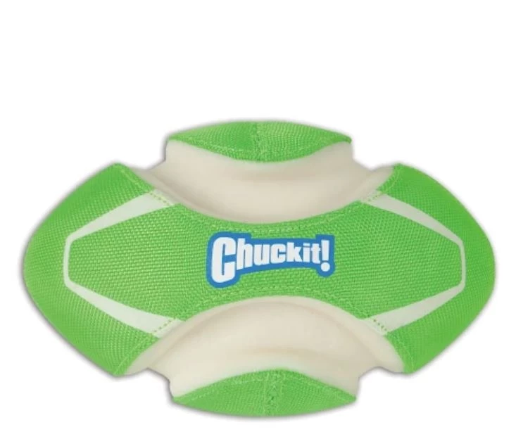 Extend fetch time to early mornings and late nights with the Chuckit!® Fumble Fetch® Max Glow® fetch toy. Charge under bright light 5 to 10 minutes for 20 to 30 minutes of high-visibility, lighted play. MAX GLOW products are made with a safe, high-quality photoluminescent material that is both chemically and biologically inert. Recharge in seconds with a bright flashlight. The Fumble Fetch Max Glow bounces erratically like a football for added fun. Easy for dogs to pick up due to the unique inverted welts. The Fumble Fetch Max Glow even floats in water. Constructed of fast charging MAX GLOW rubber, EVA foam, and 2100 denier polyester construction. Glows for up to 30 minutes. Kick or punt to play!