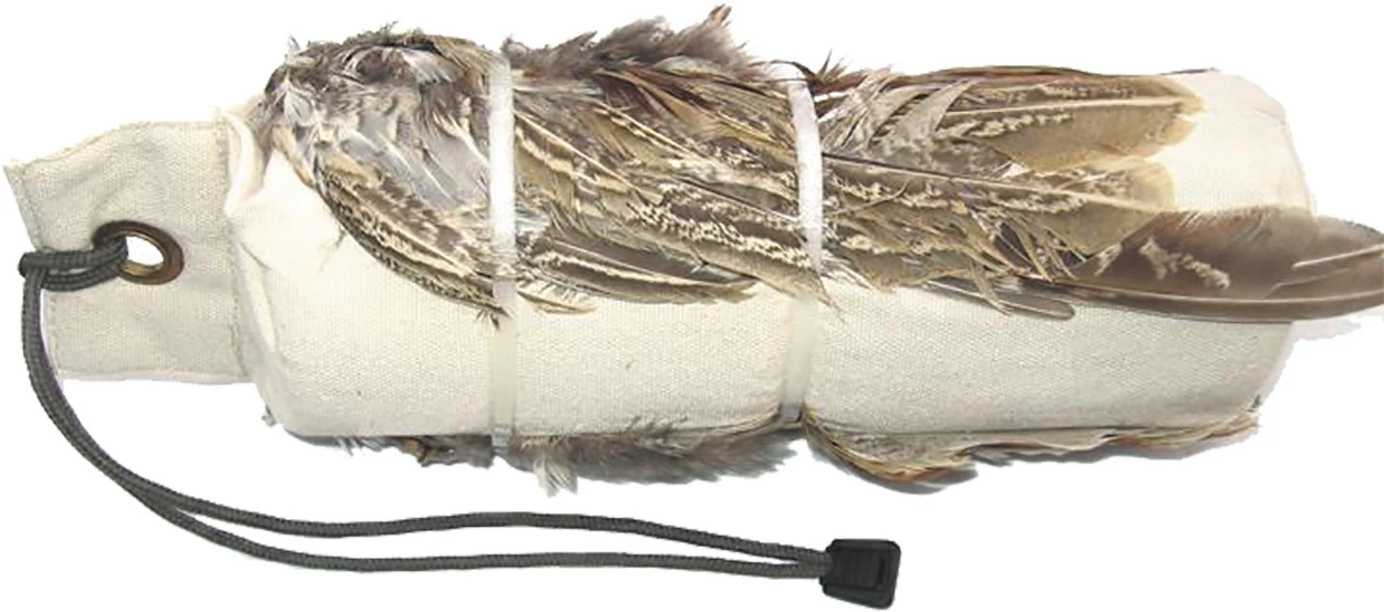Canvas dog dummy with 2 attached pheasant wings has the smell, feel & taste of a wild pheasant.