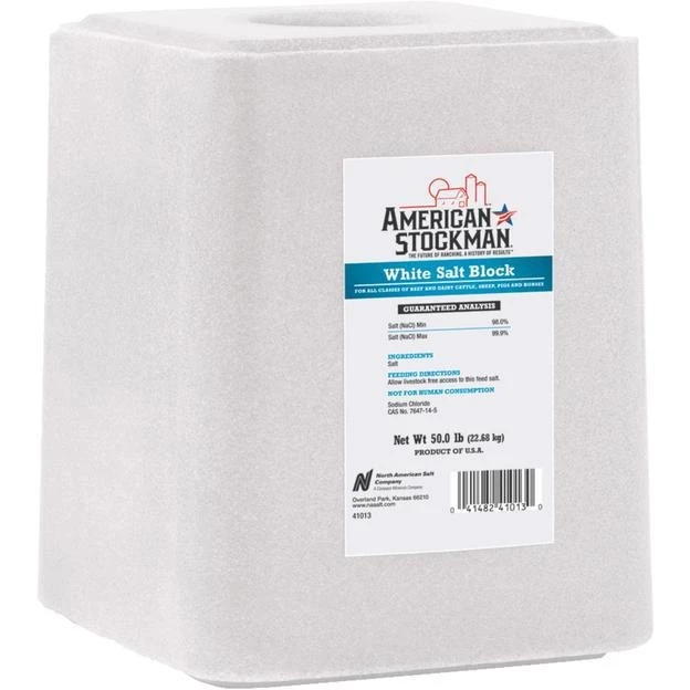 Standard plain white salt block for salt supplementation on a free choice basis or Brine making. 99.8% pure salt. 50 lb. block.