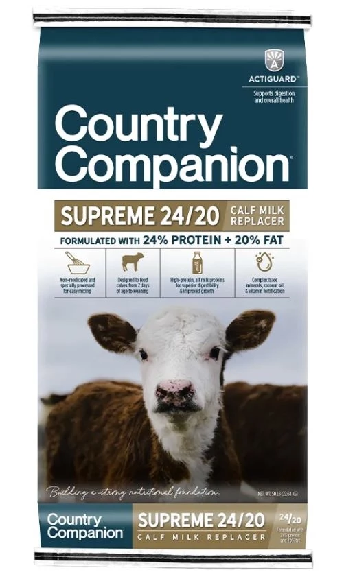 From the moment they’re born, ensuring your livestock are healthy, thriving, and resilient is your top priority. That’s why you need to choose a quality nutritional product that promotes optimal health for your young livestock.  Country Companion® Supreme 24/20 Calf Milk Replacer is a non-medicated balanced protein and fat formula that contains all milk proteins for superior digestibility and improved growth of calves. Designed to feed calves from 2 days of age to weaning, Country Companion Supreme 24/20 Calf Milk Replacer includes complex trace minerals, coconut oil, vitamin fortification and offers complete nutrition for the successful growth and development of calves. Â