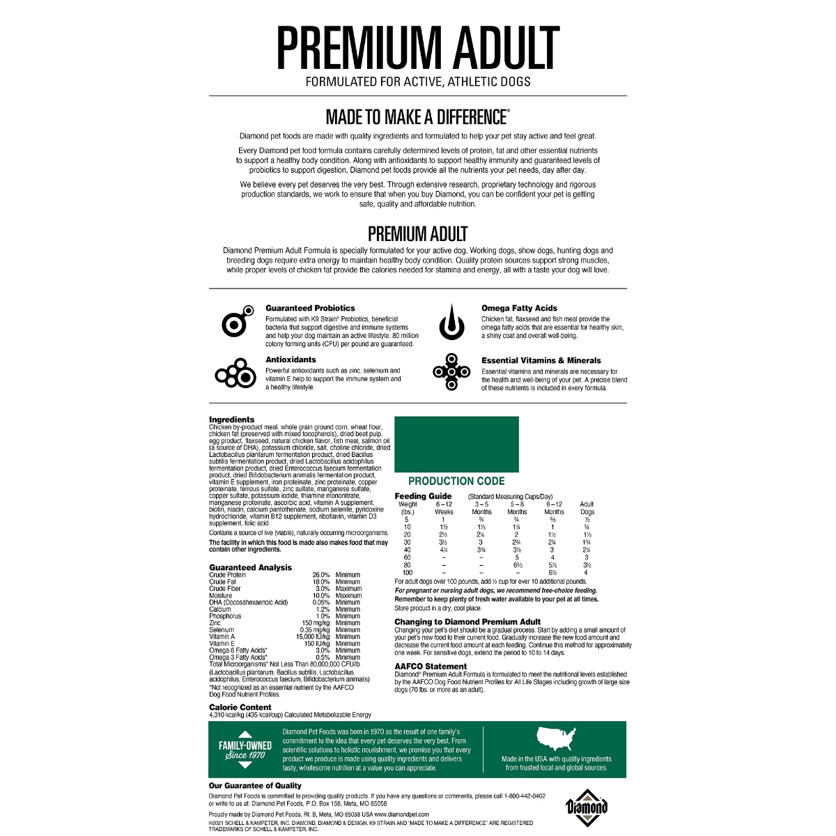 Give your canine companion the precious gift of premium nutrition with Diamond Premium Adult Formula Dry Dog Food. Formulated from the highest quality ingredients, this food is made to make a difference with carefully determined levels of protein, fat and other vital nutrients. This recipe is specially formulated for working dogs, show dogs, hunting dogs or breeding dogs that require extra energy to maintain their ideal body condition. Essential minerals are chelated with amino acids to optimize their absorption and ensure maximum benefit. It’s also fortified with antioxidants and fiber for digestive and immune system support to help make sure your best friend gets all the nutrients she needs to stay healthy and happy.