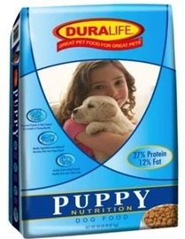 Duralife Puppy Dog food provides balanced nutrition for growth and essential protein to help support strong muscles for puppies up to one year of age.