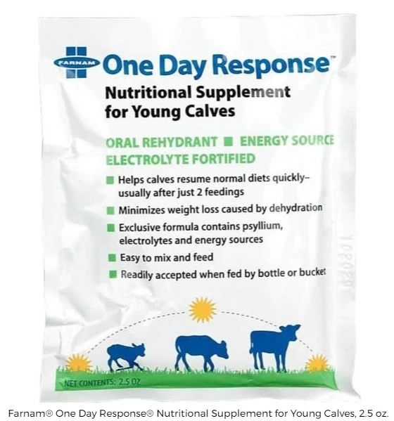 One Day Response Supplement is a patented oral rehydrate for calves. The exclusive formula contains psyllium, electrolytes, and electrolytes. It minimizes weight loss caused by dehydration and helps calves resume normal diets quickly. The easy to mix and feed formula is readily accepted when fed by buck or bottle.