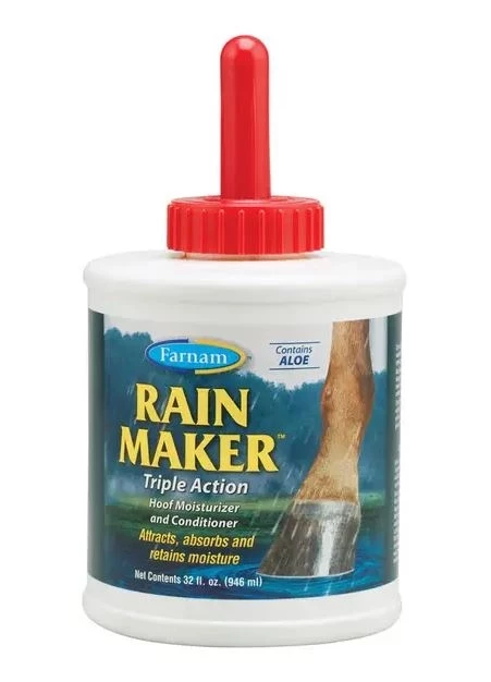 You can’t make it rain, but you can help! Thanks to a unique triple action formula, Rain Makerâ„¢ conditioner attracts, absorbs and retains moisture with neatsfoot oil, white petrolatum and glycerine. Ingredients like pine tar, lanolin and aloe help support strong hooves.