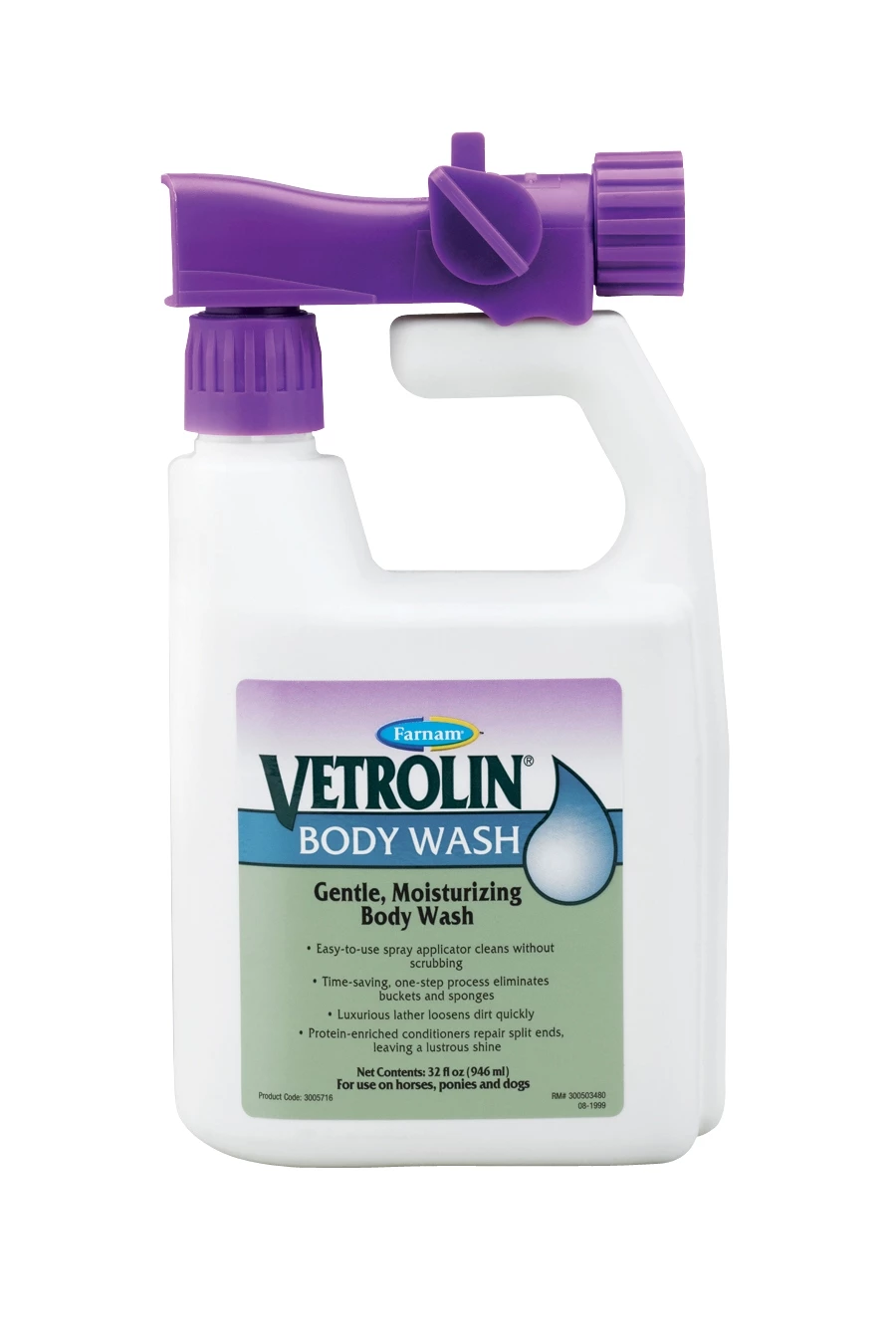 Gentle, moisturizing body wash cleans without scrubbing. Rich lather gently lifts away dirt and dandruff in minutes. Easy to use applicator eliminates buckets and sponges. Protein enriched conditioners repair split ends for a lustrous shine. Contains PABA sunscreen to protect the coat. Washes 8 to 10 horses. 32 oz. bottle with spray applicator.