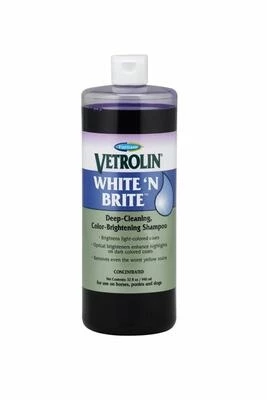 Vetrolin® White ’N Brite™ Shampoo brings out the best in all colored coats. Deep-cleaning, color-brightening shampoo adds incredible brilliance to coats, manes and tails, while leaving your horse soft and shiny. Optical brighteners reflect light off the hair to accentuate the coat’s radiance. Gentle formula contains coconut oil derivatives to moisturize and increase absorption of brightening agents.