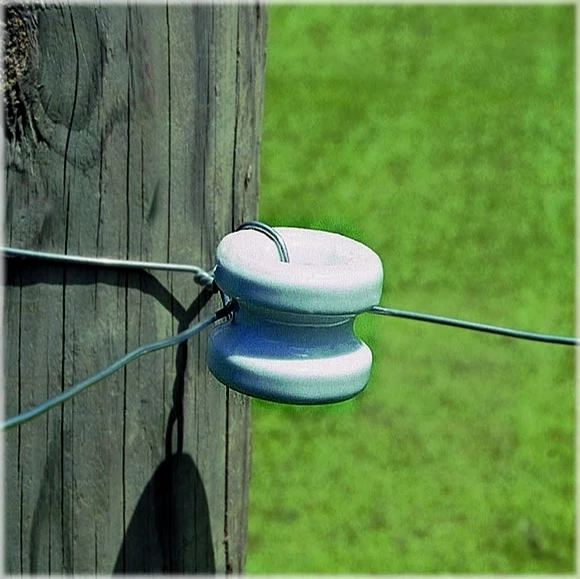 Insulator is designed for wooden corner posts and wooden end posts. This insulator can be used with a variety of wire types: steel wire, aluminum wire, polyrope, and polywire; not for use with high tensile (Not recommended for polytape).