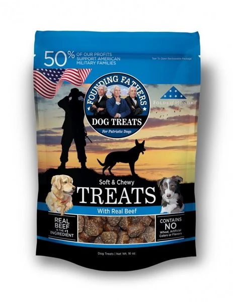 Founding Fathers Soft & Chewy Dog Treats contain real meat as the first ingredient. Our premium quality dog treats are available in 16 oz packages of Beef, Chicken or Lamb flavors. They are high in protein with no sugar added, no artificial colors or flavors and no artificial preservatives. They have a soft and chewy form that dogs crave. Founding Fathers Dog Treats are a healthy, nutritious and delicious treat for training, rewarding good behavior or any special moment!