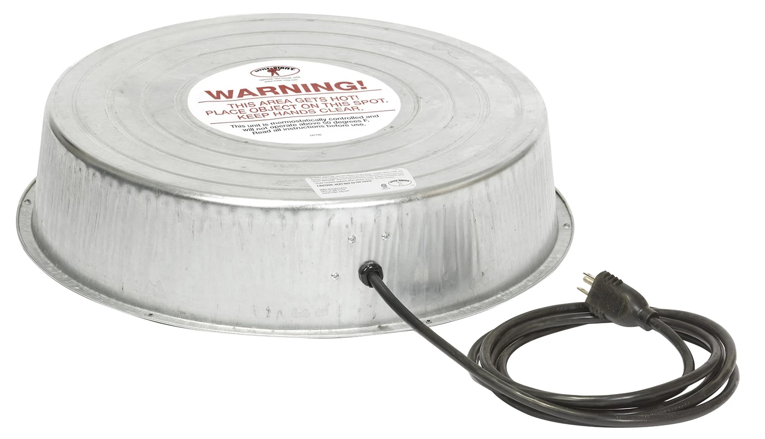 This Electric Heater Base helps prevent water from freezing in temperatures as low as 10 degrees F. Designed for use with Little Giant Double Wall Founts (Item Nos. 9832, 9833, 9835, and 9838, sold separately) and other all-metal containers. The heating element has been completely redesigned for improved safety and efficiency. The fully enclosed bottom adds another layer of protection. Perfect for unheated coops and barns; can be used outdoors in a dry, sheltered area. Made of heavy-duty, rust-resistant galvanized steel. Cord should be protected from animals and used with a Ground Fault Circuit Interrupter (GFCI) protected outlet. Unit will not draw electricity until temperature drops below freezing. Uses less than 1 amp per hour. 16.25 inch diameter by 3.687 inch high.