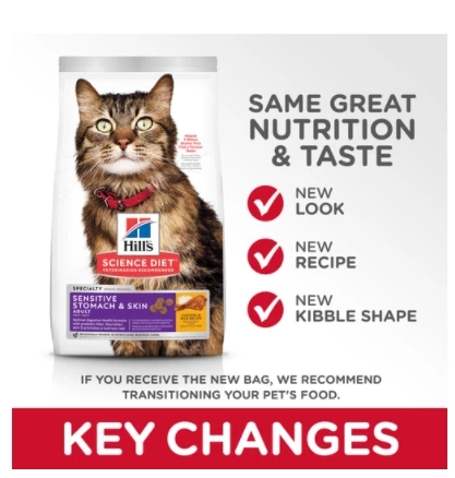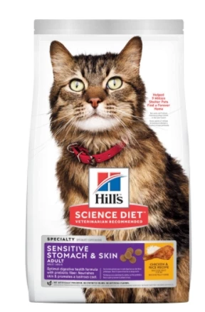 Hill’s® Science Diet® Sensitive Stomach & Skin dry cat food provides optimal digestive health while nourishing skin & promoting a lustrous coat.