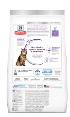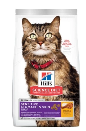 Hill’s® Science Diet® Sensitive Stomach & Skin dry cat food provides optimal digestive health while nourishing skin & promoting a lustrous coat.