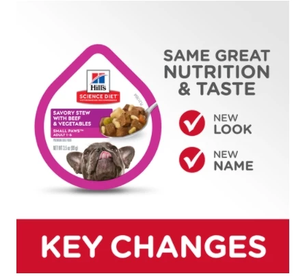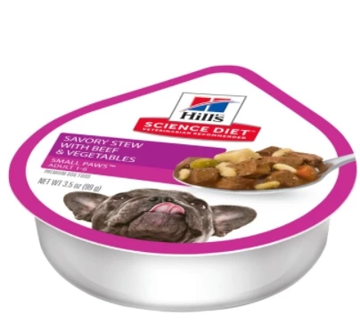 Hill’s Science Diet Adult Small Paws Savory Stew with Beef & Vegetables dog food is formulated to meet the nutritional levels established by the AAFCO Dog Food Nutrient Profiles for maintenance of adult dogs.