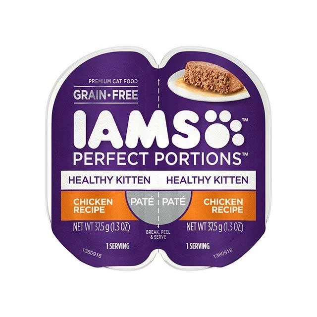 Give your kitten a fresh, flavorful meal with every peel of IAMS™ PERFECT PORTIONS™ Grain Free Healthy Kitten Cat Food. Each tray has (2) individual feeding’s worth of the wet food your kitten wants with less mess and no leftovers in the refrigerator. IAMS Healthy Kitten Paté Recipe provides the best of both tasty recipes and nutrition. Our wholesome cat food is made with vitamin E to support your kitten’s immune system and DHA for brain development.