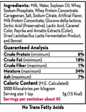 Milk, Water, Soybean Oil, Whey, Sodium Phosphate, Whey Protein Concentrate, Carrageenan, Salt, Sodium Citrate, Artificial Flavor*, Milk Protein Concentrate, Glucono-delta-lactone, Sorbic Acid (preservative), Lactic Acid, Caramel Color, Paprika and Annatto Extracts (color), Dried Lactobacillus Lactic Fermentation Product, Rennet. *Artificial Peanut Butter Flavor.