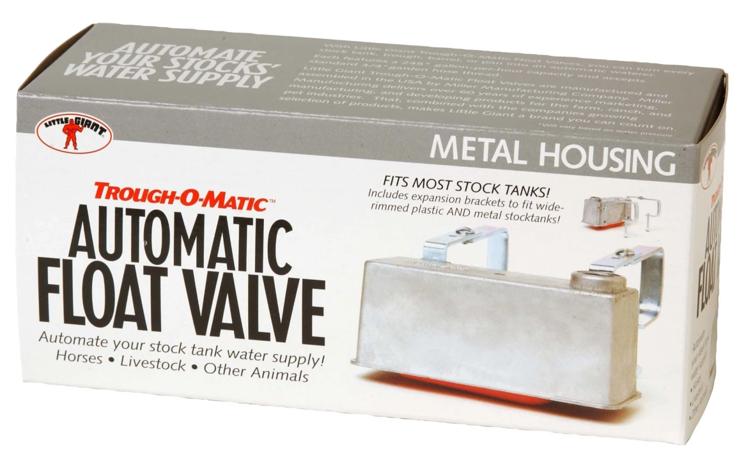 Little Giant Trough-O-Matic Float Valves automatically control the water level for most plastic and metal stock tanks, troughs, barrels, and pans. The all-metal valve flows up to 245 gallons per hour and operates at pressure between 20 and 50 psi. Durable aluminum housing with nylon orifice. Comes with expansion brackets to fit tanks rims up to 2 inch thick and 4.325 inch wide. Accepts a standard 3/4 inch garden hose. Measures 7.5 inch long by 3 inch wide by 3.5 inch high. Also available in plastic housing (Item No. TM825T, sold separately).
