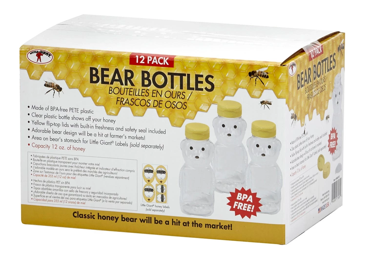 This bottle, made of BPA-free PETE plastic, will really show off your honey. Adorable bear design will be a hit at farmer’s markets! Yellow flip-top lids with built-in freshness and safety seal are included. An area on bear’s stomach will hold Little Giant honey labels (sold separately); Capacity 12 oz. of honey.