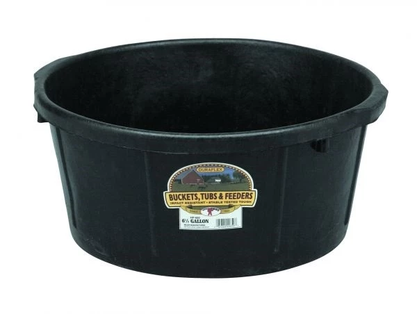 Molded from the finest corded rubber on the market, nothing matches the pliability and strength of DuraFlex rubber. Crush-proof, crack-proof, and freeze-proof so you can use it indoors or outdoors year-round. A great all-purpose tub that holds up to rugged use and abuse, with molded-in handles for easy carrying. Rubber is naturally safe and soft for animals. Perfect for livestock feeding and watering, and many other jobs around the farm, ranch, garden, and shop. 18 inch diameter by 8 inch high, holds 6.5 gallons.