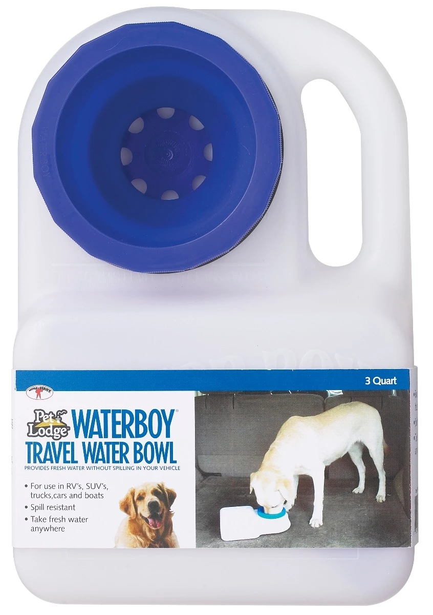 The WaterBoy allows you to take fresh, spill-free water anywhere your dog goes with you. Great for use in vehicles, boats, and RVs. It looks like a jug when sitting upright, complete with handy carrying handle. On its side, the built-in water bowl self-fills from the jug without opening it. Measures 12 inch by 8 inch by 3 inch, holds 3 quarts.