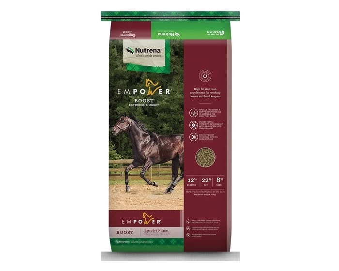 Empower Boost Horse Feed is a special blend of fat and select nutrients to give your horse a leg up to work harder, train longer, and perform better. This mixture helps your hard keeper consistently deliver a strong performance that makes you proud.