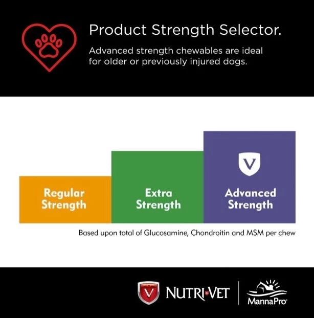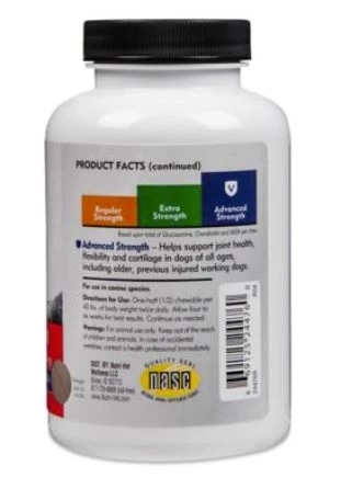 These Nutri-Vet Hip & Joint Advanced Strength Dog Chewables provide much-needed support for dogs with long-standing joint problems, especially larger and senior dogs. Each dog chewable tablet contains extra-strength levels of glucosamine for dogs, plus chondroitin, methylsulfonylmethane (MSM), and hyaluronic acid to help maintain healthy canine joint function and connective tissue. These liver-flavored joint health supplements for dogs are veterinarian formulated to provide the best joint supplement for dogs. Dog joint health never tasted so good with easy-to-administer, liver flavored dog chewables craved by pets. Formulated by veterinarians, these dog chewables are made to the highest standards of quality and consistency.