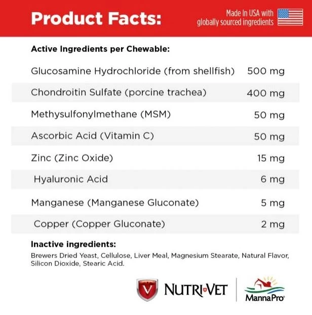 - Each dog chewable tablet contains advanced strength levels of glucosamine for dogs (500 mg), plus chondroitin (400 mg), MSM (50 mg) and hyaluronic acid (6 mg) to help dogs maintain healthy canine joint function and connective tissue
