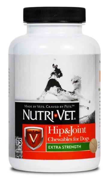 Nutri-Vet Hip & Joint Extra Strength Chewable Tablets provide balanced levels of glucosamine for dogs, plus chondroitin, methylsulfonylmethane (MSM), and hyaluronic acid to help your dog maintain healthy canine joint function and connective tissue. These liver-flavored chewables are veterinarian formulated to provide the best joint supplement for dogs.