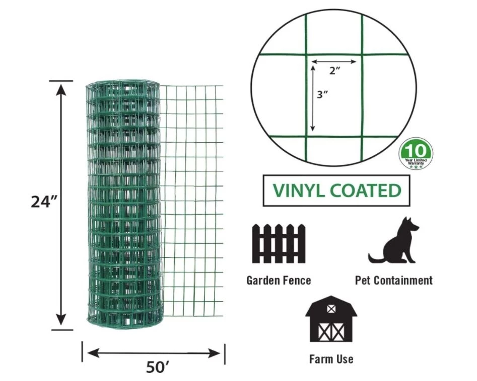 Vinyl Garden Fence, 24inx50ft is used to protect and enhance your garden. The 16 gauge steel fence is PVC coated green and blends nicely into any landscape or garden.