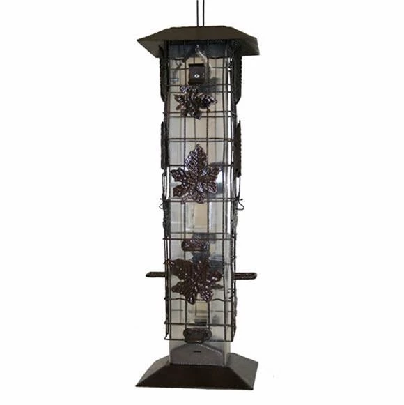 The Perky-Pet Squirrel-Be-Gone with Free Metal Hook features ports that close under a squirrel’s weight, preventing the squirrel from raiding the seed supply. Also includes U-shaped perches that allow birds to feed comfortably. The interior seed tower is surrounded by rustic metalwork. Includes FREE 23” metal hook for hanging!