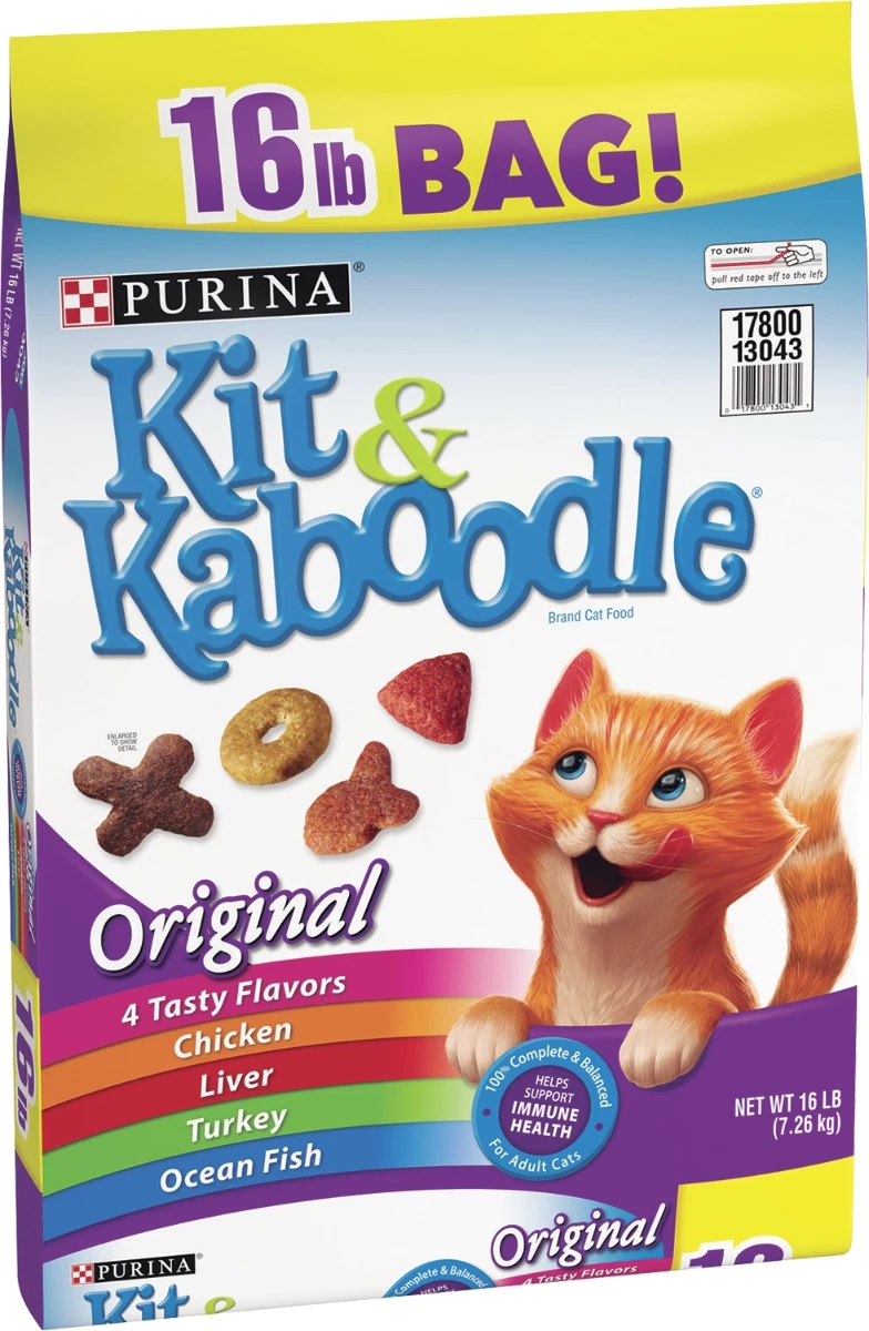 Kit & Kaboodle Original Dry Cat Food has a taste your cat will love!. A lip-smackin’ combination of four cat-pleasing flavors—chicken, liver, turkey and ocean fish. Variety? Oh, yeah. Four flavors and four fun shapes… no “bowl boredom” happening here! Nutrition? You know it.