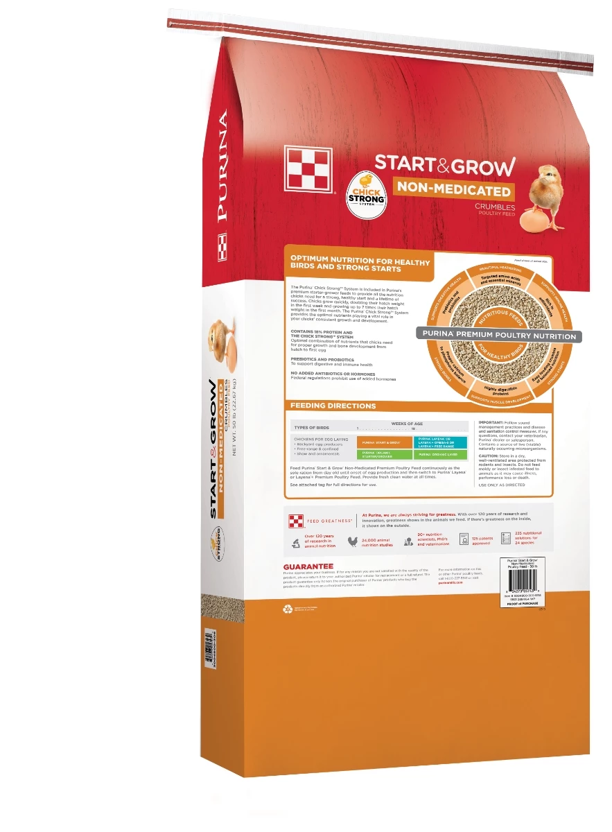Purina Start & Grow is formulated with optimum nutrition for raising laying chicks from hatch to laying age (18-20 weeks). This complete feed with 18% – protein and quality nutrients is perfect for a strong start and early hen development. Formulated with prebiotics, probiotics and yeast to support optimum digestive health and immune function.