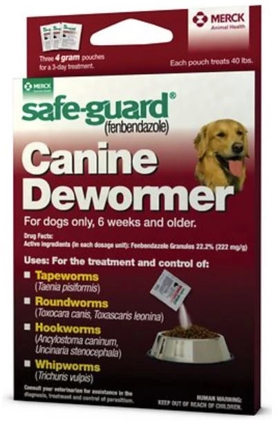If your dog tests positive for internal parasites, your vet may prescribe Safe-Guard (fenbendazole) Canine 4 gm to treat and control those parasites. This product is effective against the four major types of parasites in dogs, including roundworms, hookworms, whipworms and taenia tapeworms. It’s easy to feed—just mix the powder into your dog’s food and make sure that your pup eats the full dose. You’ll need to repeat the dose for three days in a row. This deworming medication is considered safe for use in all dogs ages six weeks and older, including pregnant dogs.
