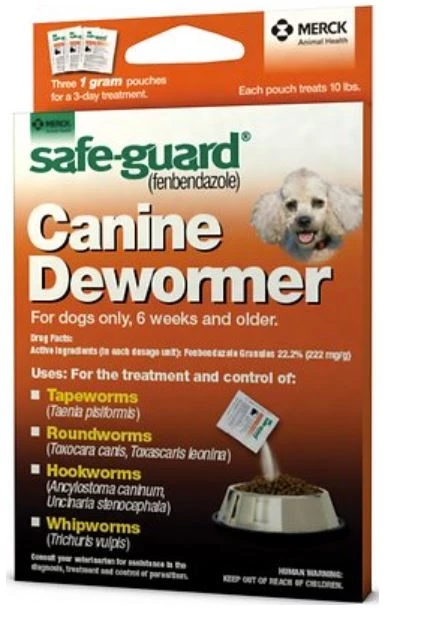 If your dog tests positive for internal parasites, your vet may prescribe Safe-Guard (fenbendazole) Canine 1 gm to treat and control those parasites. This product is effective against the four major types of parasites in dogs, including roundworms, hookworms, whipworms and taenia tapeworms. It’s easy to feed—just mix the powder into your dog’s food and make sure that your pup eats the full dose. You’ll need to repeat the dose for three days in a row. This deworming medication is considered safe for use in all dogs ages six weeks and older, including pregnant dogs.