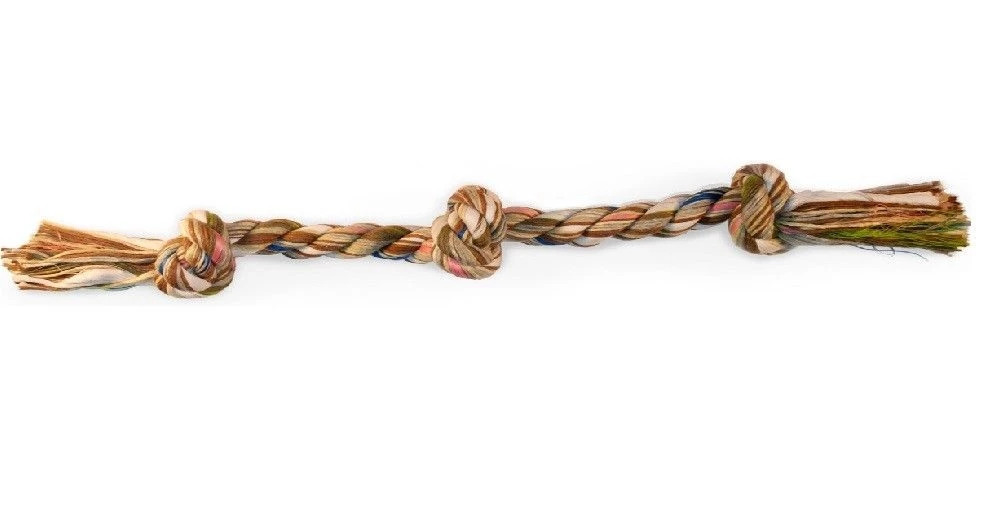 Fabric rope features 3 knots for gripping and chewing. Great for tugging and retrieving. Helps encourage dental health by cleaning teeth and exercising gums. Outlasts rawhide.