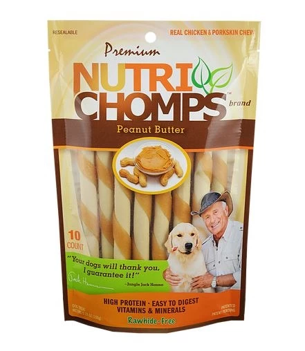 Nutri Chomps are a rawhide-free dog chew. Nutri Chomps are high in fiber & protein and low in carbs. Nutri Chomps first ingredients are chicken and pork skin making them fully digestible. Nutri Chomps are a safe & healthy rawhide alternative. These mini twists come in peanut butter flavor. The 6″ twisting shape makes it a perfect chew for tiny, small and medium dogs.