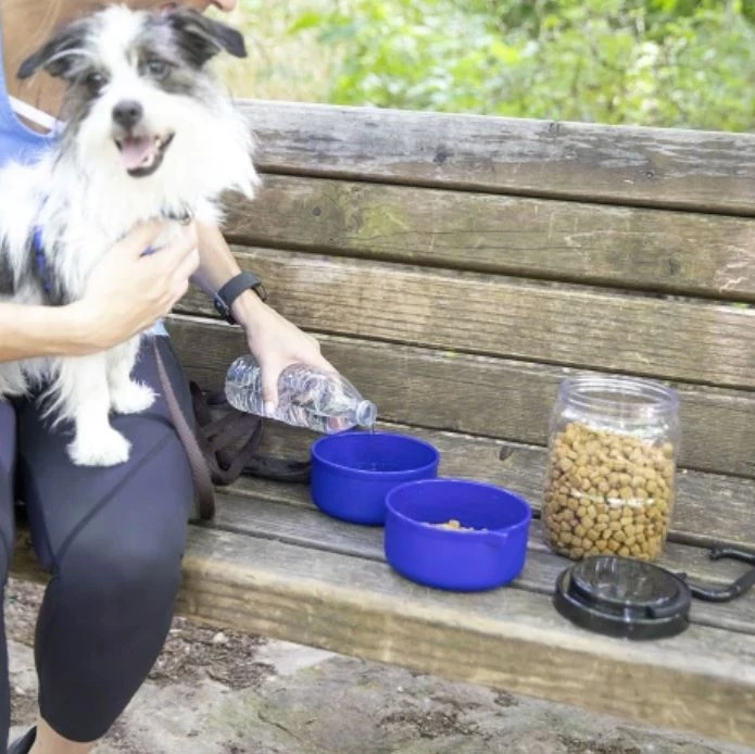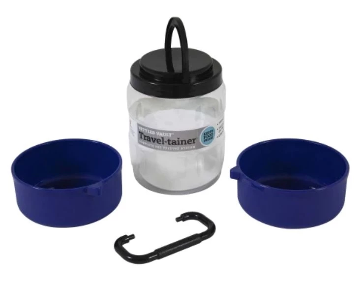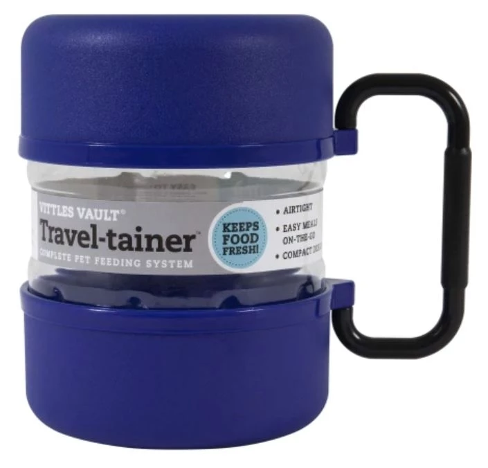 Make traveling with your dog easier with the Vittles Vaultâ„¢ Travel-Trainer. This portable food storage container is designed to keep your pets food fresh as well as provide maximum convenience for pet parents by transforming from a pet food storage container to a feeding and watering system in seconds. Ideal for road trips, beach trips, camping, office visits, daycare, and more, the Travel-Trainer comes with a 6-cup food storage container, two 3-cup bowls for food and water, and a carry handle. To use, just remove the carry handle, twist off the top, pull off the food and water dishes, and pour. Made from BPA-free, food-grade plastic and features an airtight seal that will keep your pets food fresh and tasty during travel.