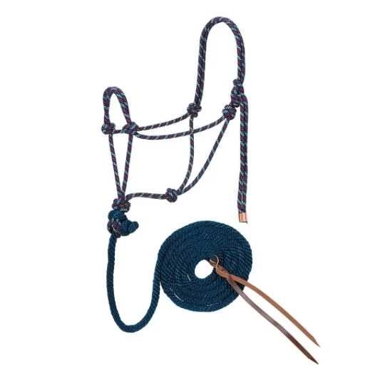 A great halter at a great price! This halter is made from a continuous piece of 3/8″ poly rope with a hand-knotted construction and a double noseband and crown strap. The hollow braid spun poly lead measures 1/2″ x 10′..